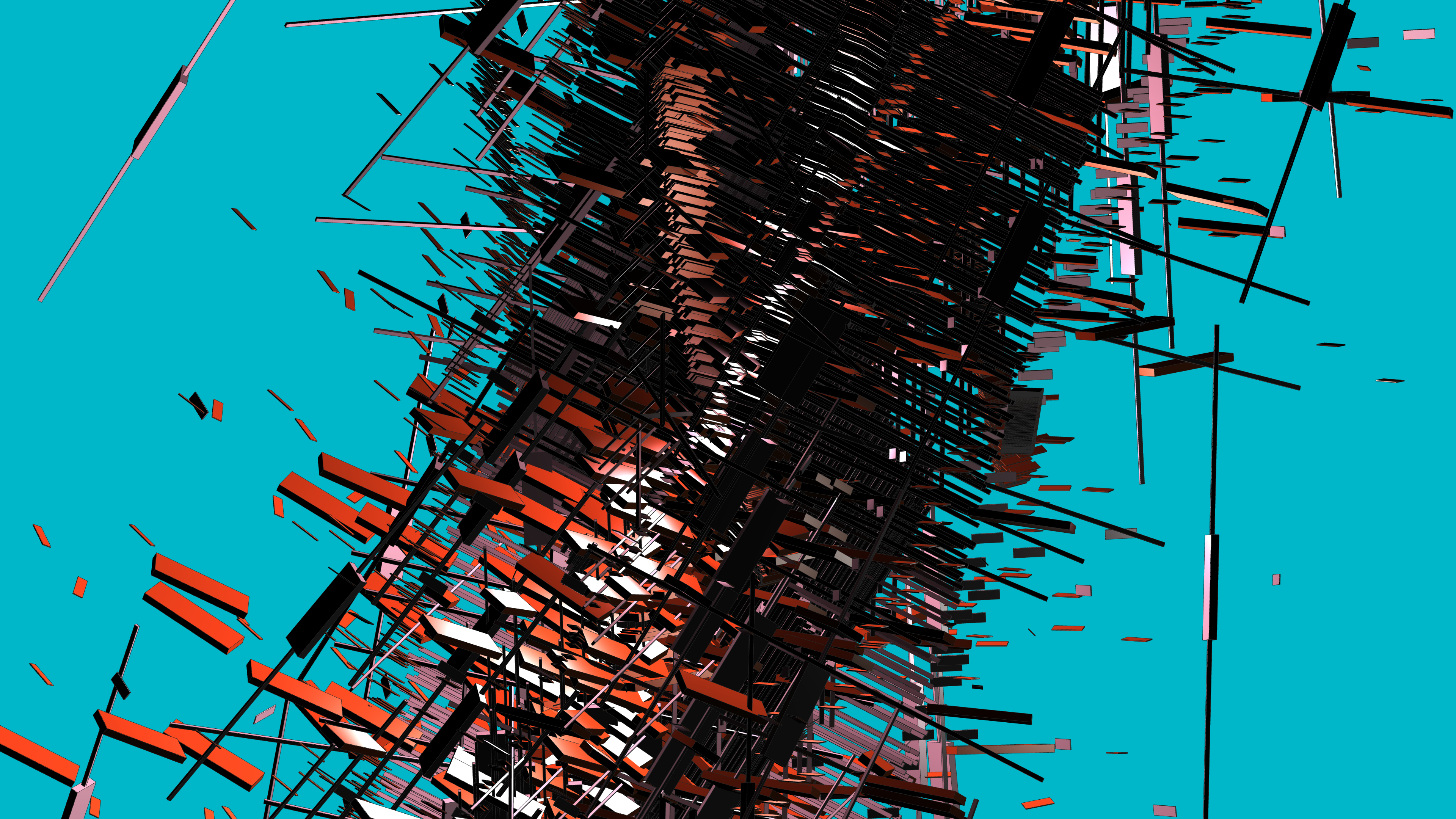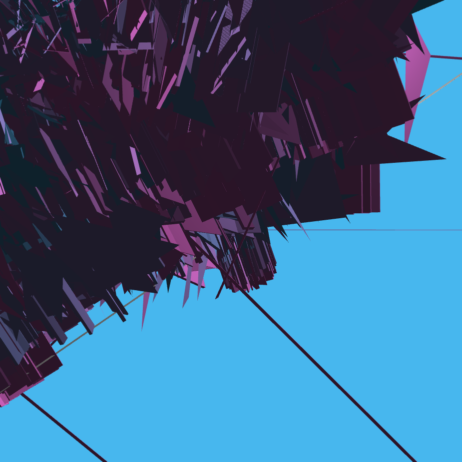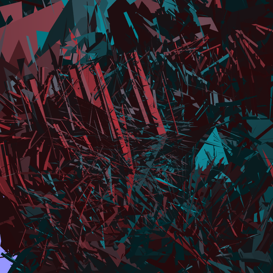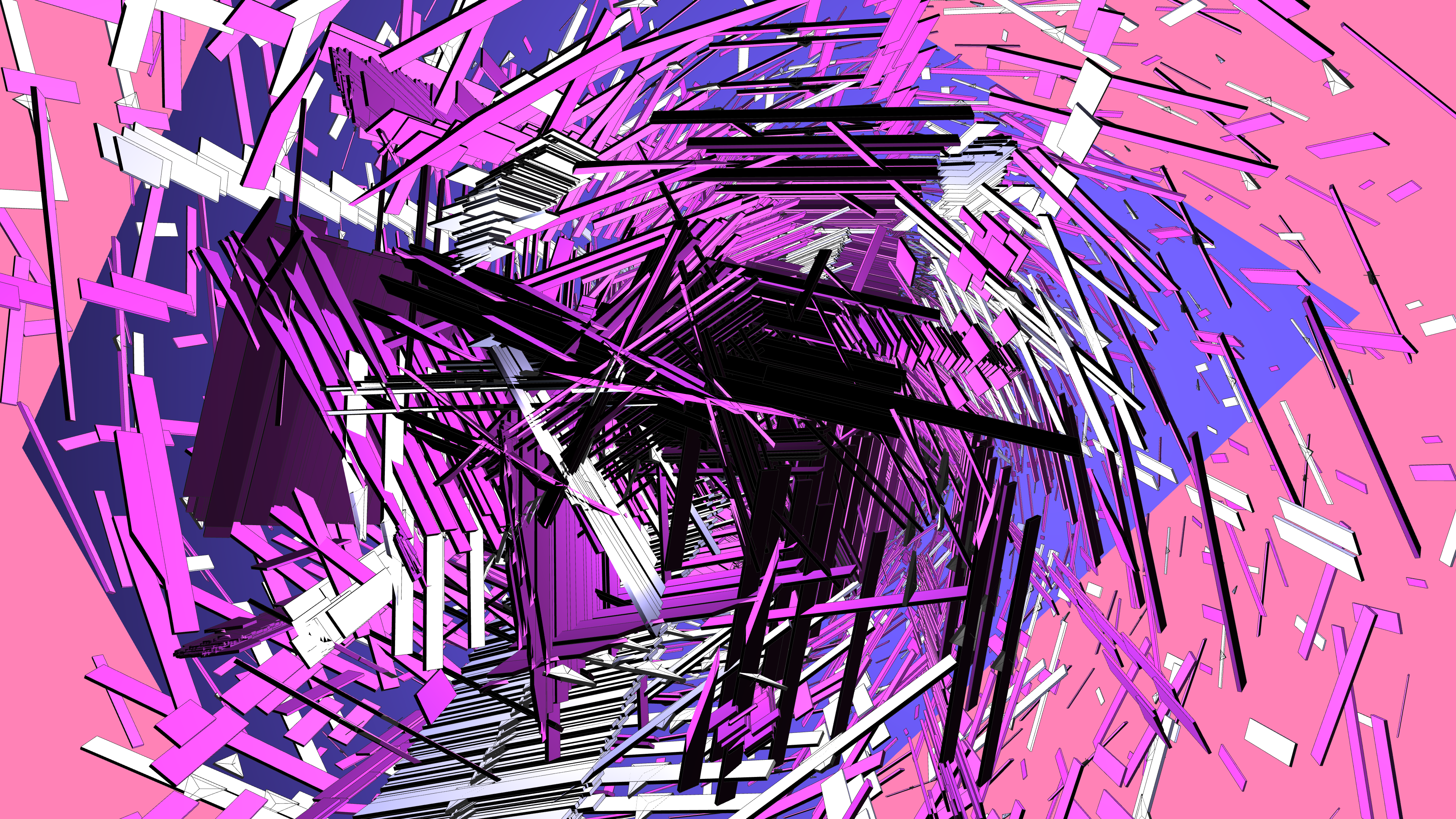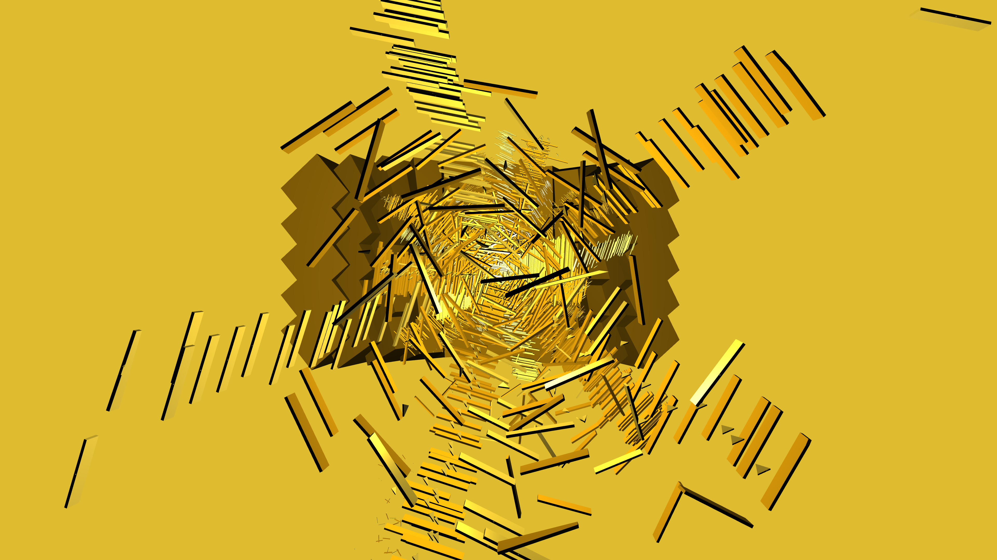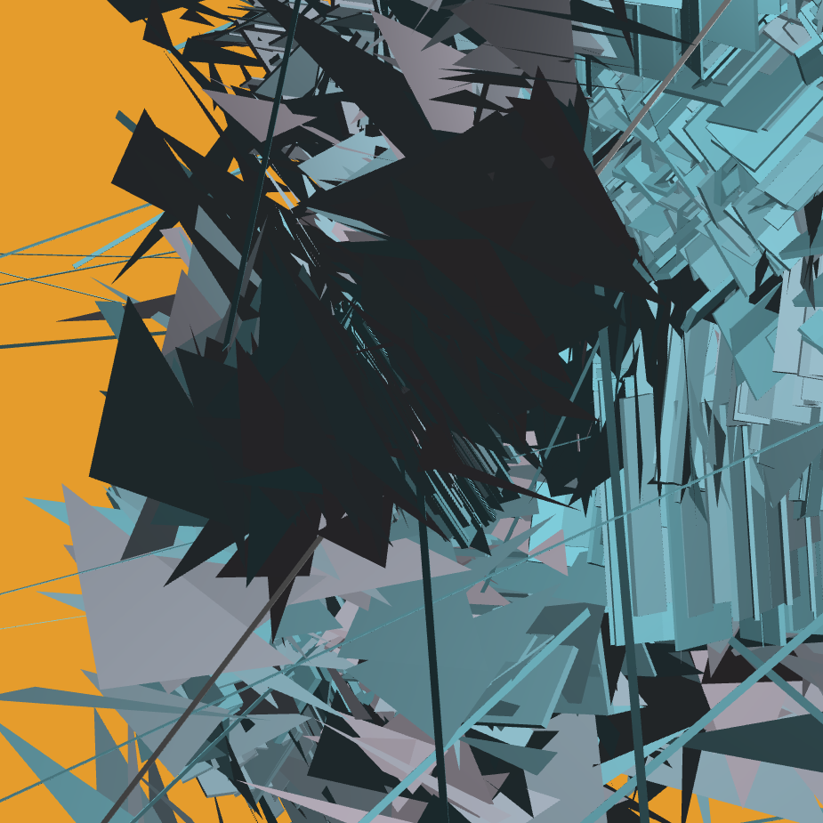 Simple shapes generate complex and chaotic snapshots of a larger form, still image with a sense of rapid motion going through repetitive sequencing of parametrized mathematical functions, rotations and placement of objects. The parameters for sequence attributes, shapes, lighting, materials and colors are driven by the hash of the minting transaction, producing unique and surprising results.