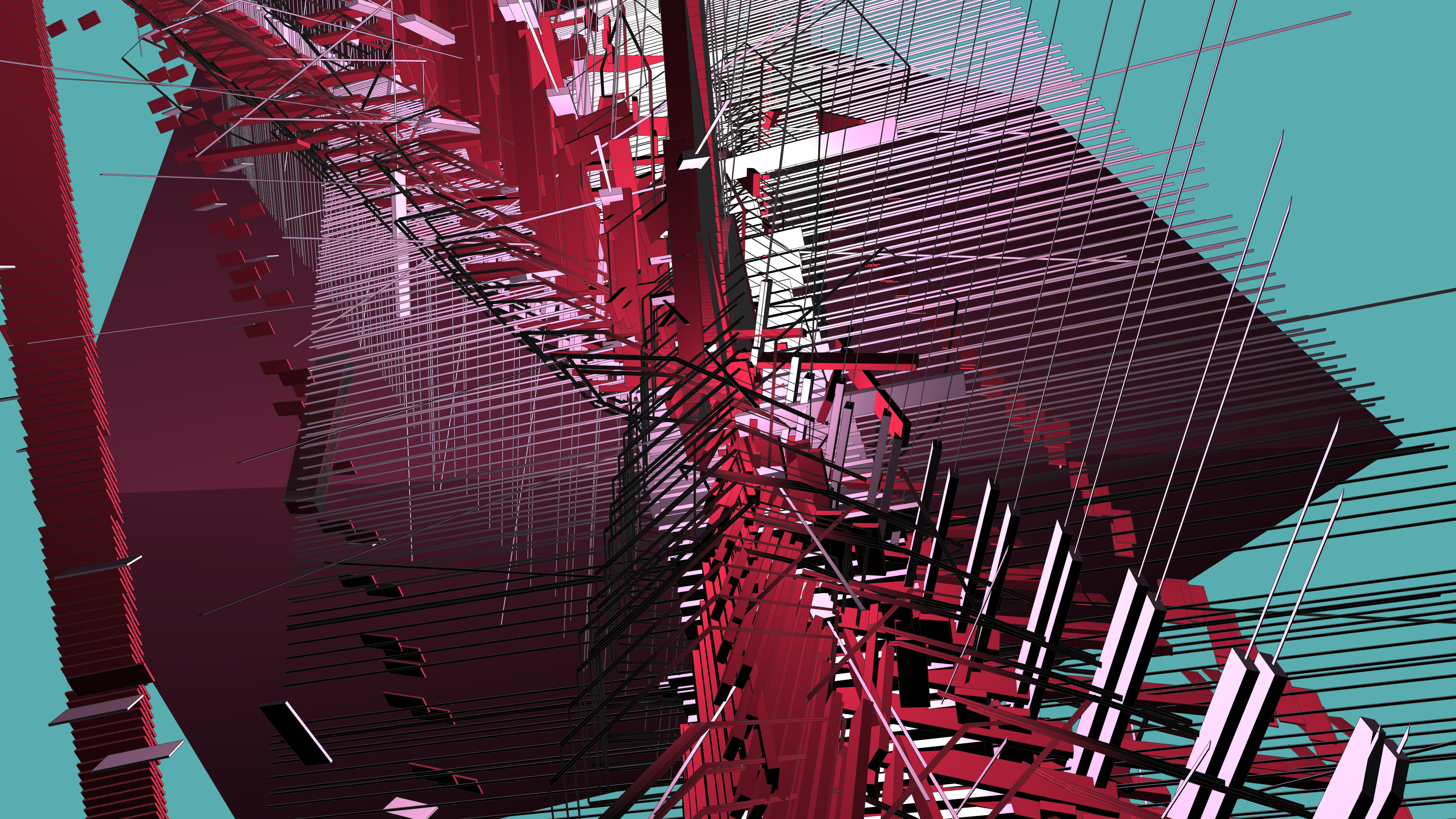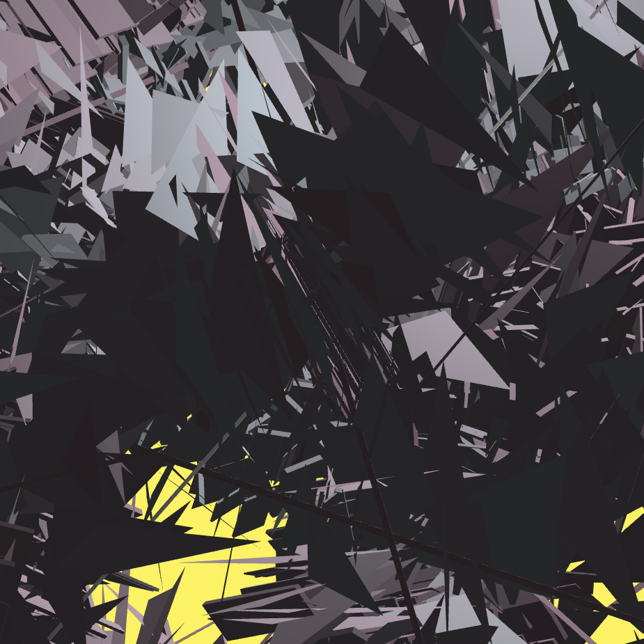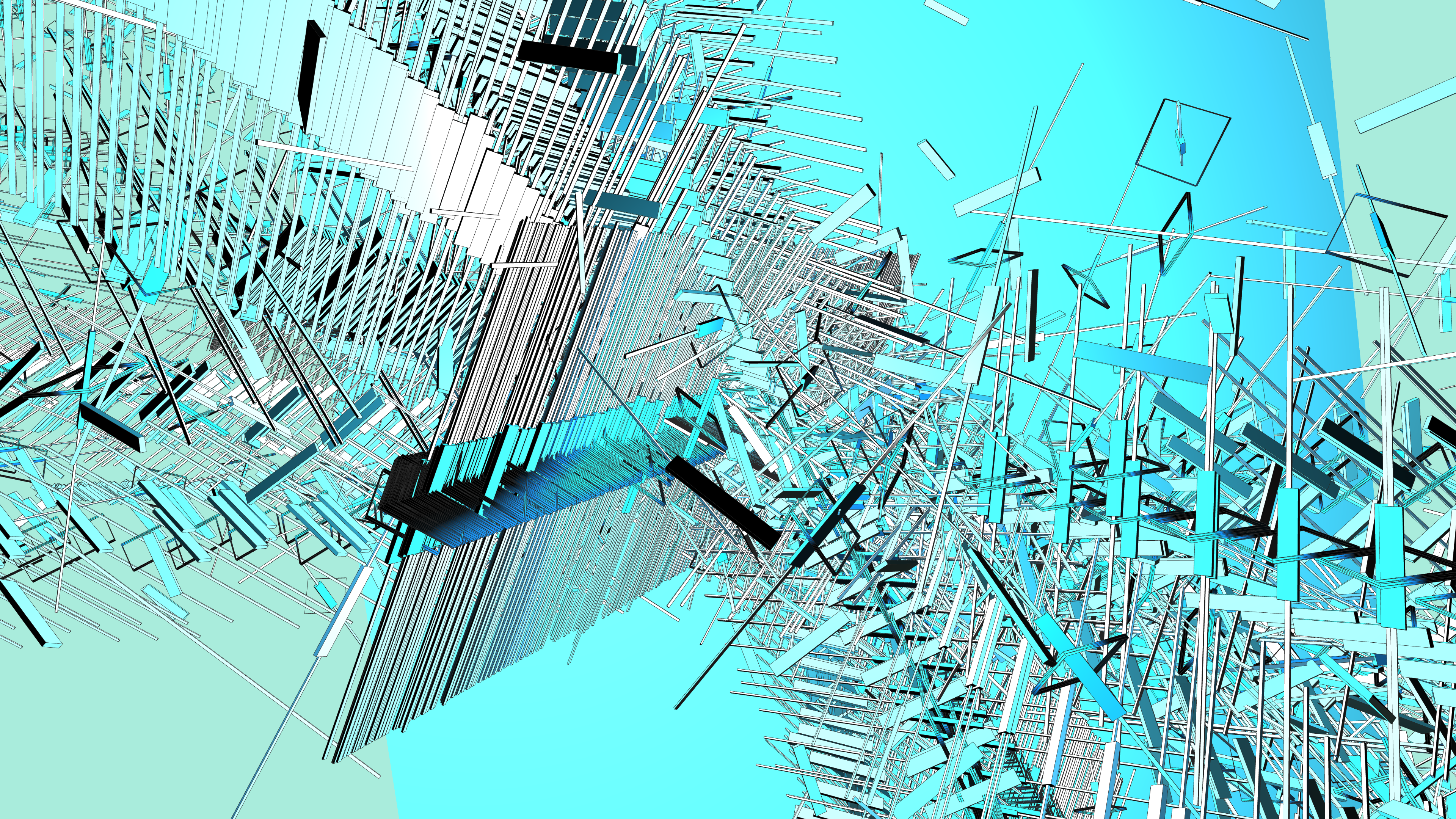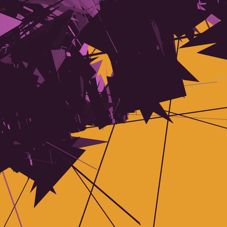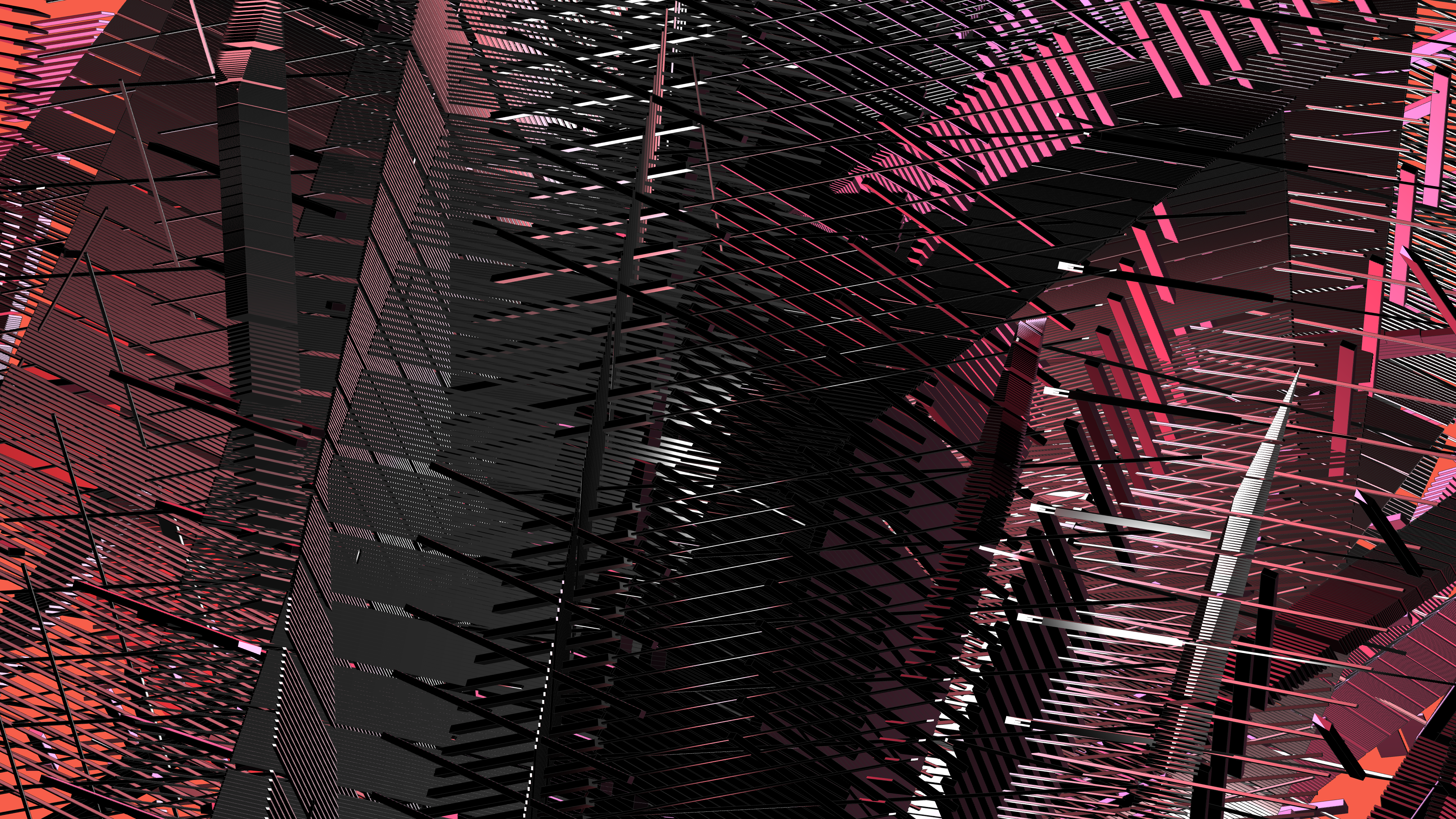 Simple shapes generate complex and chaotic snapshots of a larger form, still image with a sense of rapid motion going through repetitive sequencing of parametrized mathematical functions, rotations and placement of objects. The parameters for sequence attributes, shapes, lighting, materials and colors are driven by the hash of the minting transaction, producing unique and surprising results.